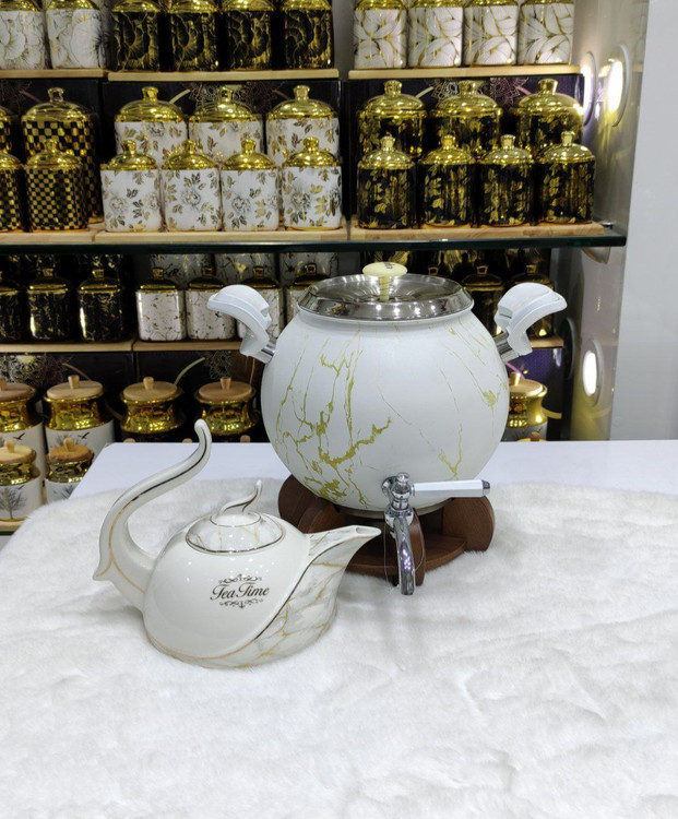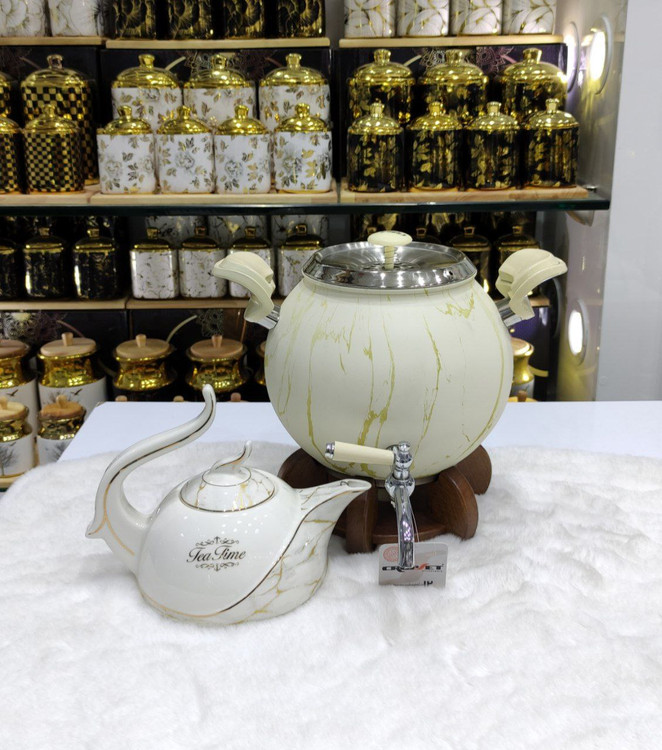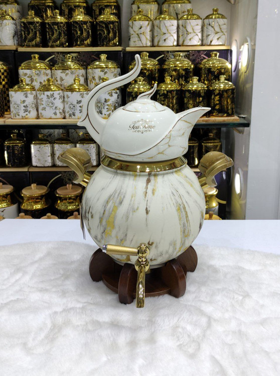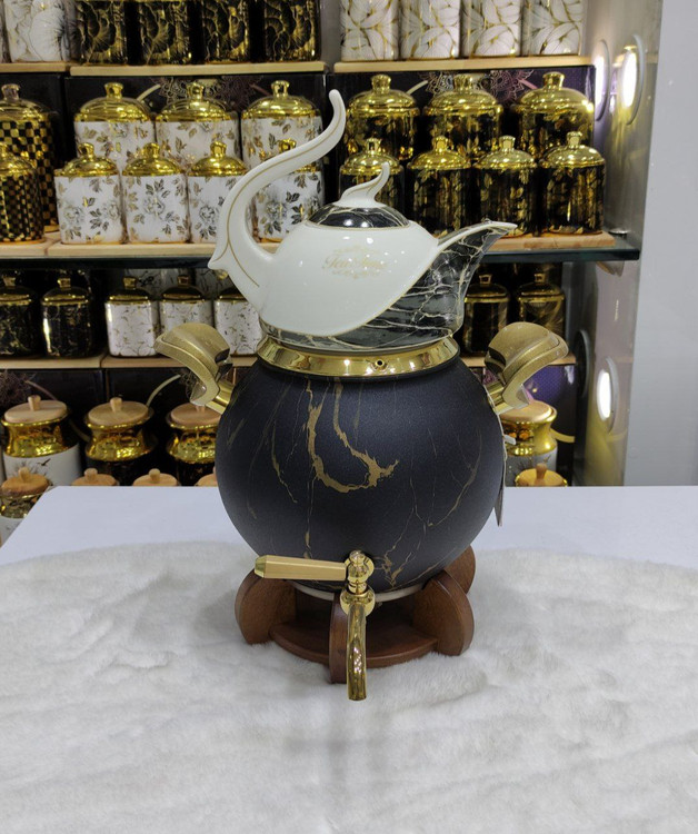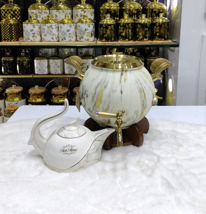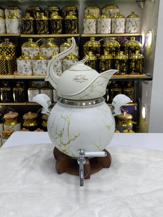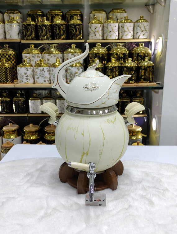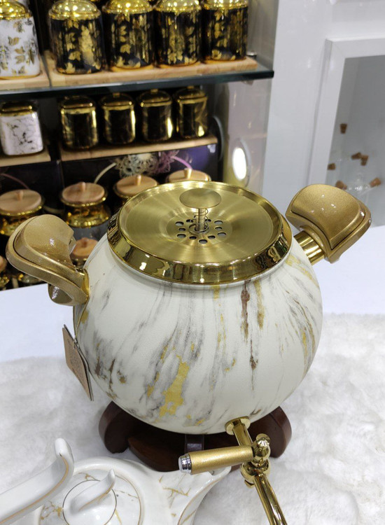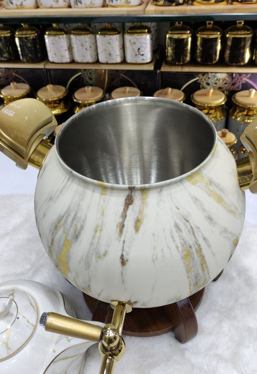 کتری قوری ماربل با پایه چوبی وارمر دار